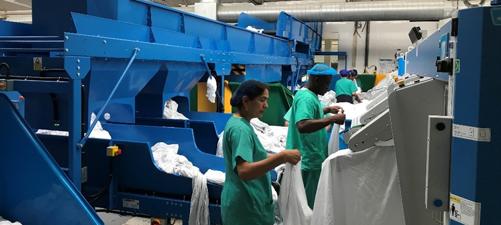À la réception, le linge sale est acheminé rapidement des camions de livraison vers les zones de tri ou de lavage grâce à des convoyeurs à bande. Le tri peut également être effectué sur ces convoyeurs, selon la configuration de la blanchisserie. Après lavage, le linge propre est pressé en boule pour éliminer l'excès d'eau, puis transporté par des convoyeurs vers une zone de tri ou directement vers les séchoirs. Une fois séché, le linge est acheminé par d'autres convoyeurs vers les équipes d'opérateurs qui alimentent les presses à repasser et les plieuses.