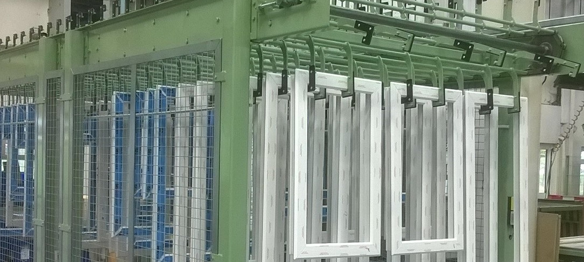 Ci-dessus se trouve une unité de refroidissement et de stockage en fin de chaîne de production pour les cadres de fenêtres en PVC.