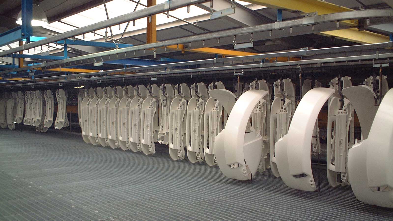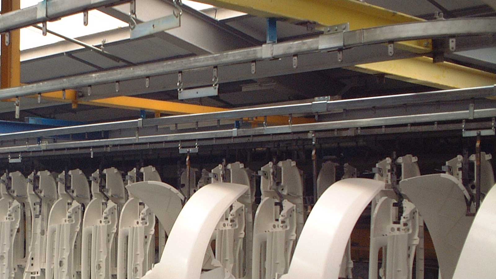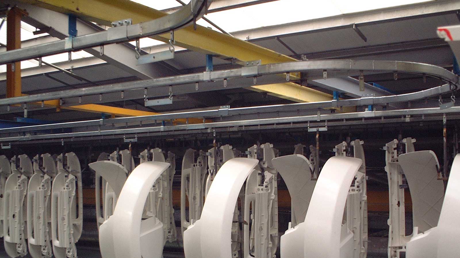 Cette gamme de convoyeurs comprend les modèles PT30, PT60, PT100 et PT100S. Ces systèmes sont composés d'une chaîne biplane entraînée par un moteur et se déplaçant dans un rail en acier fermé, de section rectangulaire ou cruciforme pour les charges plus importantes. Des supports, fixés à la chaîne à intervalles réguliers, dépassent d'une fente située sous le rail et permettent de suspendre le produit.
